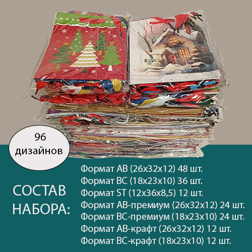 Набор из 84 пакетов 26*32*12, 12 пакетов 12*35*10 и 72 пакета 18*23*10. 7 форматов по 1-2 упак.