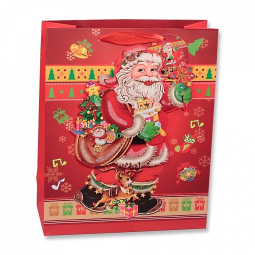 Новогодняя ламинированная сумка с объемной аппликацией Деда Мороза. Четыре варианта рисунка. В упаковке 12 штук по 3 штуки каждого новогоднего дизайна.
