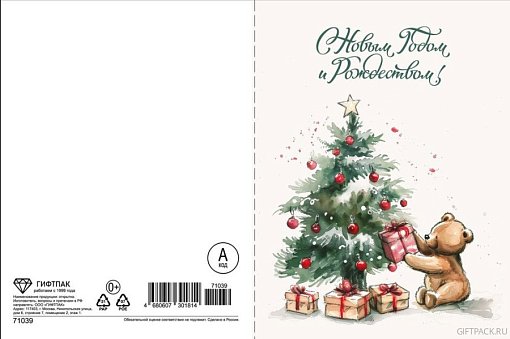 71039 Двойная открытка Код А Медвежонок, елка и подарок. NG