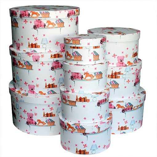 Размеры коробок: D 35 H 17.3 см, D 31.5 H 16.8 см, D 29.5 H 15.8 см, D 27.5 H 14.7 см, D 24.5 H 13.8 см, D 22.5 H 12.8 см, D 20.5 H 11.8 см, D 19 H 10.8 см, D 16.8 H 9.7 см, D 15.3 H 8.7 см. В наборе 10 коробок. Цена указана за весь набор. Рисунок соответствует изображению.