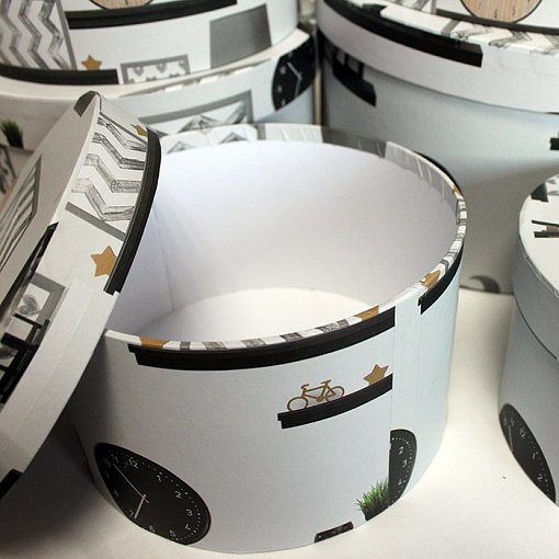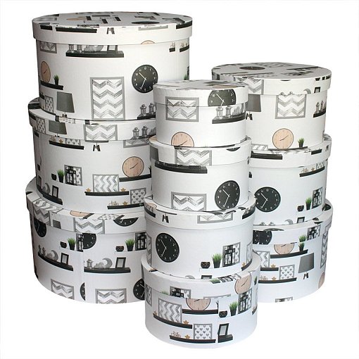 Размеры коробок: D 35 H 17.3 см, D 31.5 H 16.8 см, D 29.5 H 15.8 см, D 27.5 H 14.7 см, D 24.5 H 13.8 см, D 22.5 H 12.8 см, D 20.5 H 11.8 см, D 19 H 10.8 см, D 16.8 H 9.7 см, D 15.3 H 8.7 см. В наборе 10 коробок. Цена указана за весь набор. Рисунок соответствует изображению.