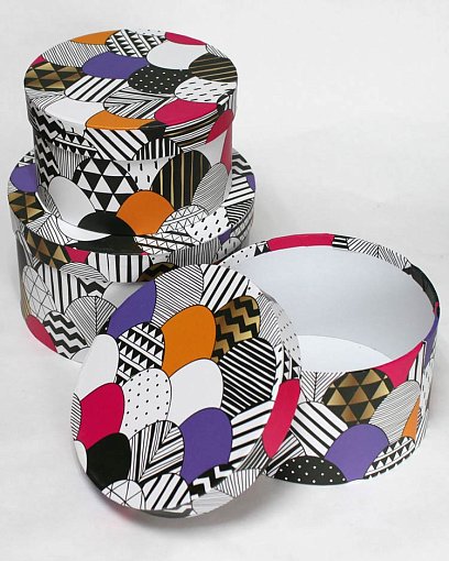 Размеры коробок: D 35 H 17.3 см, D 31.5 H 16.8 см, D 29.5 H 15.8 см, D 27.5 H 14.7 см, D 24.5 H 13.8 см, D 22.5 H 12.8 см, D 20.5 H 11.8 см, D 19 H 10.8 см, D 16.8 H 9.7 см, D 15.3 H 8.7 см. В наборе 10 коробок. Цена указана за весь набор.